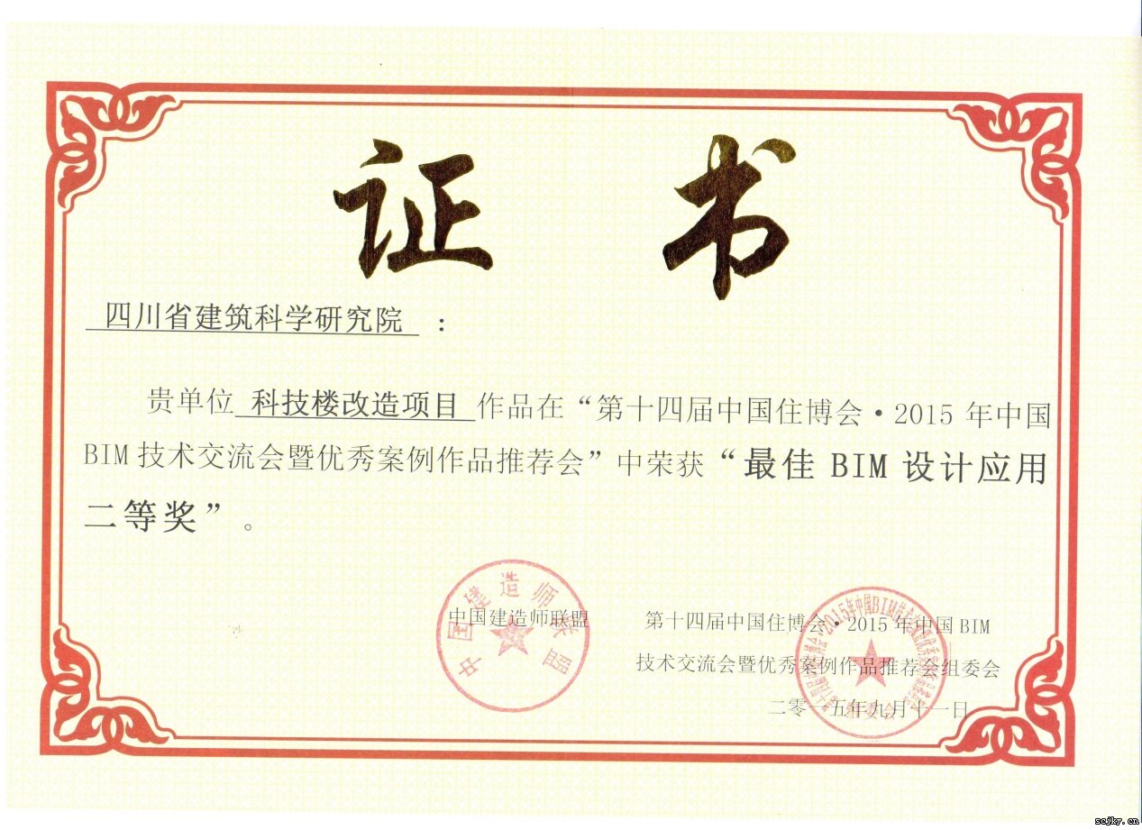 第十四屆住博會是由住建部支持,中國建筑師聯(lián)盟等單位主辦的國家級大型博覽會,以“明日之家為引領,促進創(chuàng)新型發(fā)展”為主題,重點關注住宅產(chǎn)業(yè)化及工業(yè)化。BIM論壇作為住博會的主要論壇之一,于9月11日在北京國際展覽中心舉辦。在接到參賽邀請后,我院設計二所積極配合準備,提交了科技樓改造項目BIM應用的相關資料,獲得了與會專家評委的一致好評,獲得“最佳BIM設計應用獎二等獎”。這標志著經(jīng)過不間斷的努力,BIM團隊建設已初見成效。