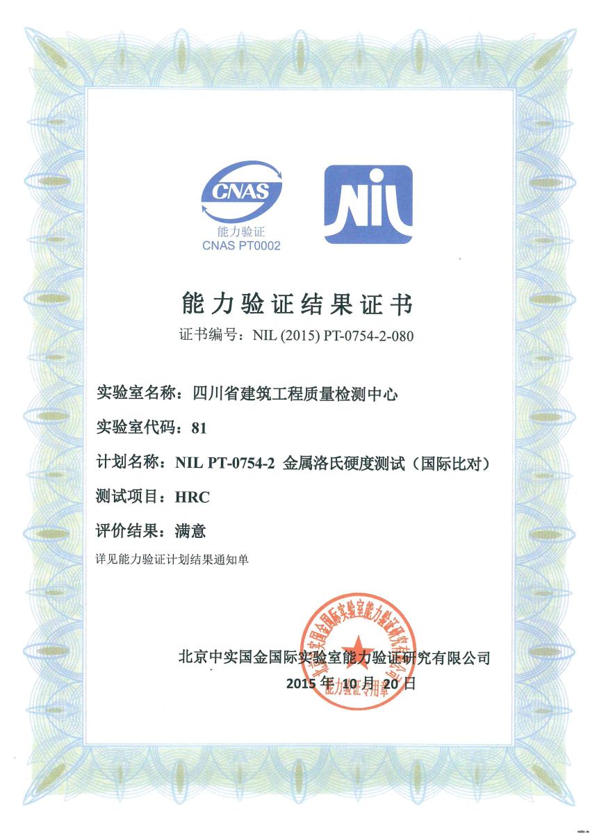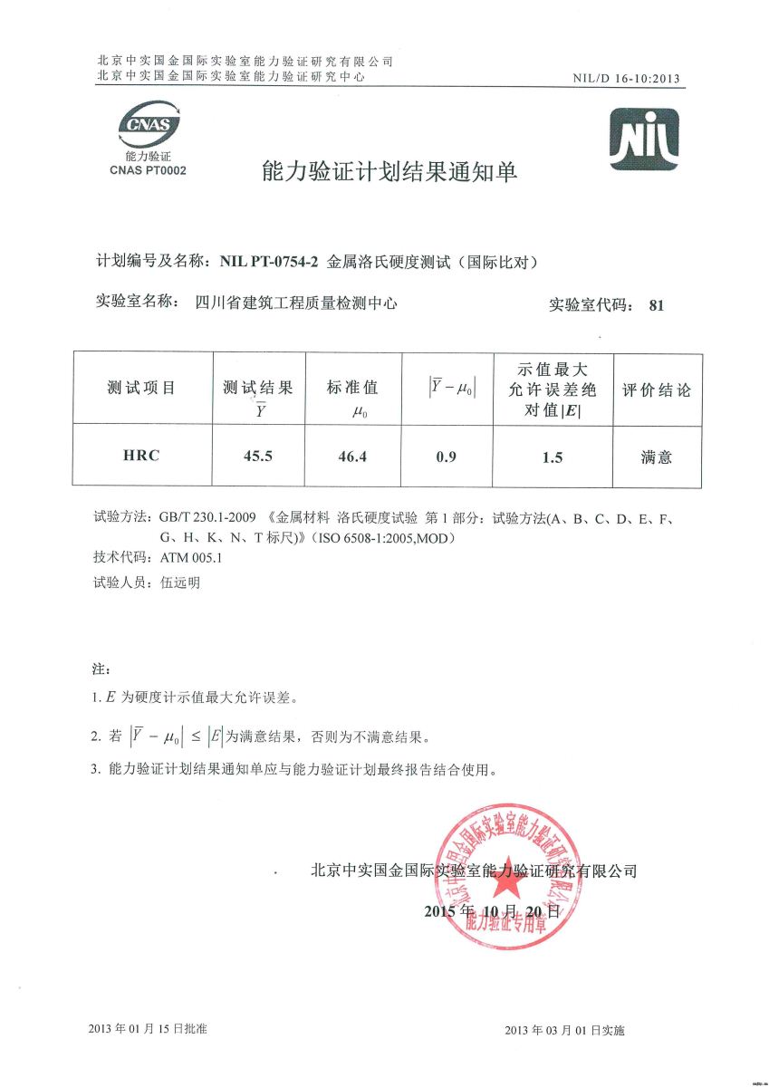 近日,四川省建筑科學(xué)研究院檢測(cè)中心接到北京中實(shí)國(guó)金國(guó)際實(shí)驗(yàn)室能力驗(yàn)證反饋結(jié)果,該中心參加的一項(xiàng)金屬洛氏硬度測(cè)試能力通過國(guó)際比對(duì),驗(yàn)證結(jié)果為滿意。